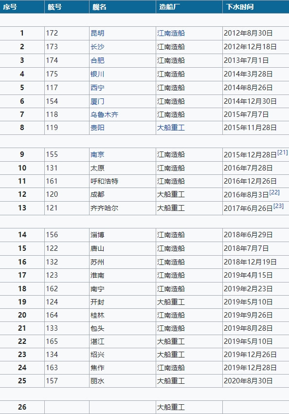 以下是部分中國(guó)海軍艦艇的舷號(hào)及艦名: