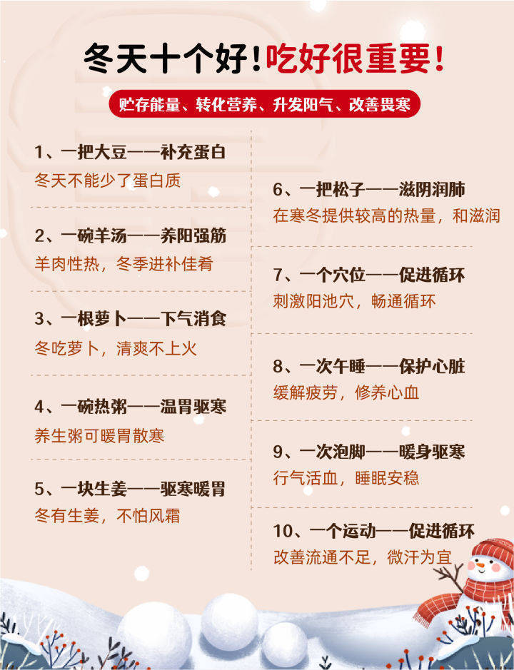 還需要注意的是,冬季養(yǎng)生要根據(jù)自身情況來(lái)制定具體的養(yǎng)生方案,不同的人體質(zhì)不同,需要根據(jù)自己的身體狀況來(lái)選擇適合自己的養(yǎng)生方法,還要保持良好的心態(tài),積極面對(duì)生活,這樣才能在冬季養(yǎng)生中取得更好的效果。
